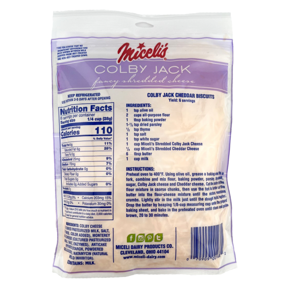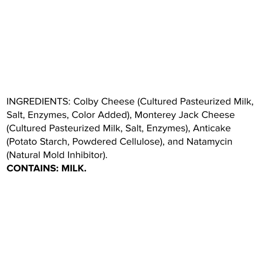 A perfect balance of creamy and tangy, our Shredded Colby Jack combines the smooth, mild flavor of Colby cheese with the rich notes of Monterey Jack. Expertly shredded for convenience, it melts beautifully making it ideal for tacos, nachos, casseroles, and all of your favorite cheesy recipes. Whether sprinkled over a salad or baked into a dish, this vibrant blend adds the perfect touch of flavor and texture.