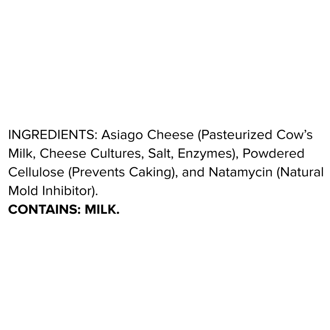 Bold and flavorful, our Shredded Asiago adds a sharp, tangy kick to any dish. Perfect for melting over pasta, stirring into risotto, or sprinkling on salads, this finely shredded Asiago made with high-quality milk brings a rich, nutty taste that elevates the flavor profile of your favorite recipes. Its smooth texture and robust flavor make it an essential staple for every home cook.